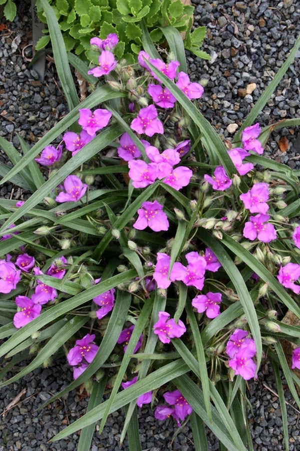 Tradescantia tharpii is a little-known spiderwort named after the late Texas botanist Benjamin Tharp. His namesake hails from the hilly prairies and open woodlands in Kansas, Missouri, Oklahoma, and Texas. The small, 8" tall x 1' wide, deciduous, hairy-leaved rosettes are topped, starting in late April (NC), with clusters of violet to violet-blue flowers. After flowering ceases in late May, we recommend cutting the plant to ground for a new round of flowers and foliage. Tradescantia tharpii typically goes dormant for us in late summer. Tradescantia tharpii has been a top performer in our garden without the weedy reseeding traits of many of its cousins. Tradescantia tharpii is a moist woodland native plant, but it has also performed well for us in the dry, sunny rock garden.