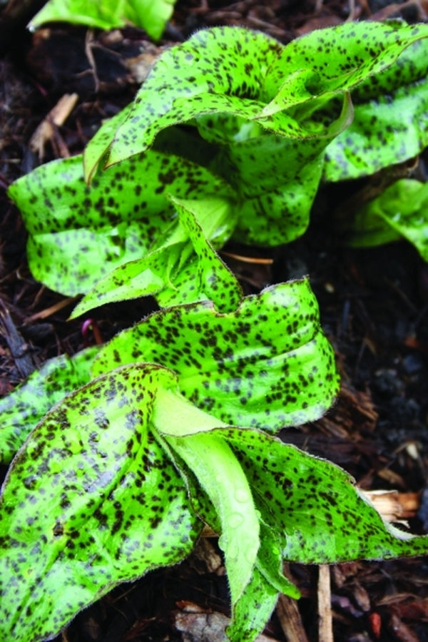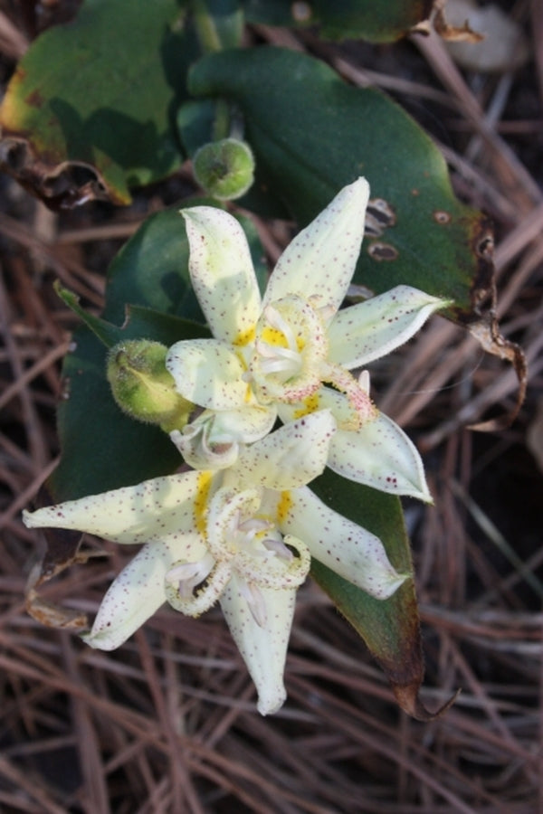 Tricyrtis 'Amanogawa' is an old Japanese hybrid of Tricyrtis perfoliata x Tricyrtis hirta, that's surprisingly difficult to find. The arching genes from the Tricyrtis perfoliata parent makes this toad lily perfect to arch over a rock or through ferns. The stems are clothed, from very late summer through early fall, with brown speckled leaves, leading to the creamy yellow, lightly speckled, orchid-like flowers at the end of each stem. "Amanogawa" is Japanese for "Milky Way Galaxy."