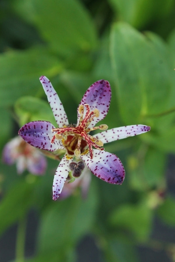 Tricyrtis 'Omokage' is a dwarf, compact, clumping toad lily hybrid from Japan, derived from a cross of Tricyrtis formosana and Tricyrtis lasiocarpa. Tricyrtis 'Omokage' produces 12" tall stalks, topped with single-branched terminal floral spikes from mid-September through mid-October (NC). The white flowers are tipped in lavender and speckled with tiny lavender spots.