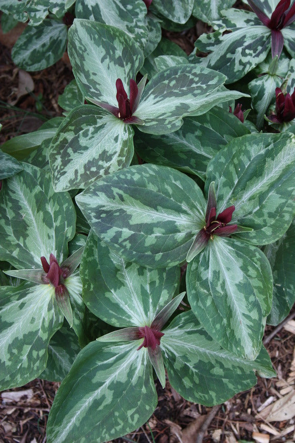 Despite being endemic to only a small region of beech forests and floodplains on both the Louisiana and Mississippi sides of the Mississippi River, Trillium foetidissimum is just as hardy in Minnesota. This amazing sessile trillium sprouts a 10" stalk in early spring topped with three olive-green leaves dramatically highlighted with dark blotches. Atop the leaves are the narrow, maroon-red petals. Trillium foetidissimum is extremely easy to grow in a wide range of garden conditions. Our offering represents 5-year-old flowering-sized plants grown from seed here at PDN. The original parent clone for this offering was collected outside Baton Rouge, Louisiana.