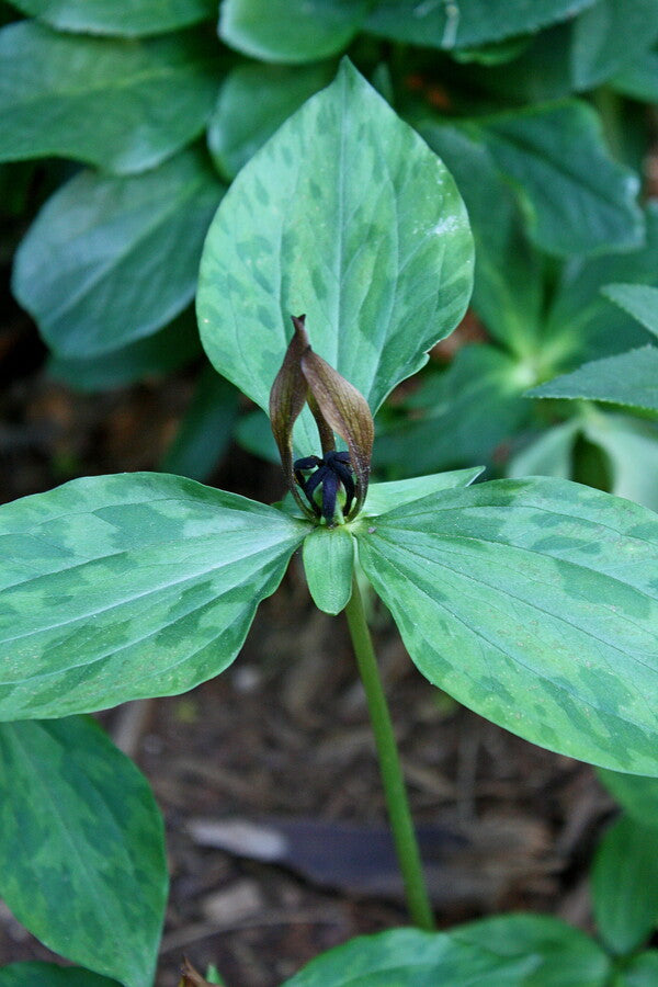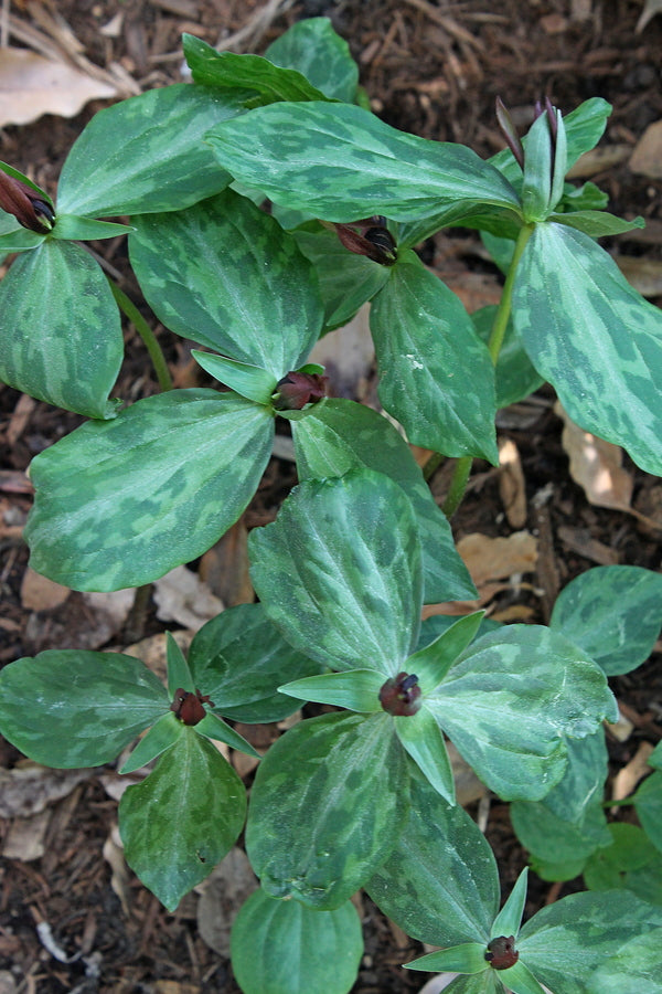 (aka: T. lancifolium A1AL-054) Trillium lancifolium 'White Plains' are our flowering seedlings from an original plant from Alabama's Calhoun County at 760' elevation where they grew in large masses in a seasonally flooded woodland. The 6-8" tall stalks are topped with dark olive mottled leaves that are wider and more oblong than the normally pointed leaves that Trillium lancifolium is named for. Topping the foliage are the very narrow dark purple petals, which are much narrower than is typical with the species. Trillium lancifolium 'White Plains' is very easy to grow in typical garden conditions, but it really thrives in moist sites. These are in fairly short supply, and since they take 5 years from seed, this will be it for a while.