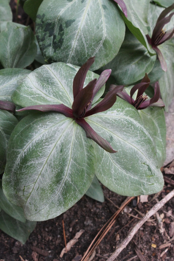 Trillium ludovicianum 'Caldwell Silver' is our 2023 introduction of a new seed strain, derived from a single stem of a solid-silver leaf clone of Trillium ludovicianum we collected in Louisiana's Caldwell Parish in 2004. Our offering are all flowering-size seed grown plants, maturing around 10" tall, with solid silver leaves, topped, starting for us in early March with sessile dark purple petals. It's taken us 17 years to produce enough to offer, so don't delay if you want to add this to your garden.