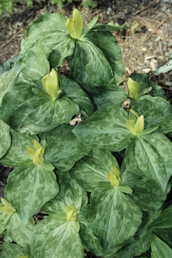 We are ecstatic to offer flowering-sized, nursery seed-propagated plants of the East Coast native (Kentucky to Virginia) Trillium luteum. The seed came from Tennessee's Monroe/Cumberland Counties on the eastern end of the Cumberland Plateau. For us, the clumps begin flowering in mid-April (NC) with green- and silver-flecked foliage topped with a lemon-scented butter yellow flower...truly one of the most stunning of the genus. In the wild, Yellow toadshade is usually found in alkaline soil regions, but we have found it to adapt well to slightly acidic soils.
