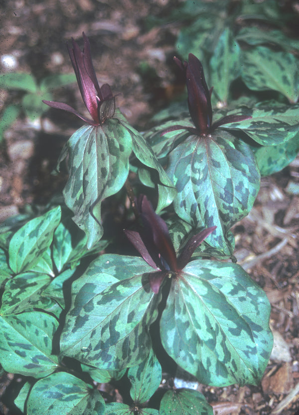 Our 2008 Plant Delights/JLBG introduction of the southeast native, Trillium maculatum, comes via PDN-grown seed from an original plant collected from a logged-over floodplain near the northern end of its range in Edgefield County, South Carolina. In the garden, these have been particularly vigorous and have developed nice offsetting clumps...very stunning in the spring garden. The olive-green foliage is nicely marked with liver-purple speckles, topped in early spring with upright purple petals. Moist soils are best, although Trillium maculatum is quite drought-tolerant when dormant. These are all flowering-sized plants and are 4-5 years old from seed.