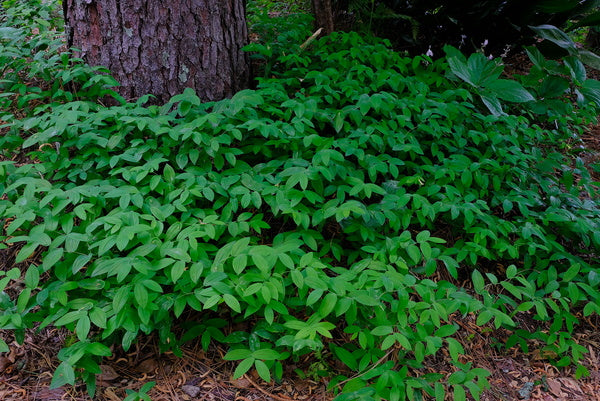 Uvularia perfoliata 'Super Spreader' is a 2022 Plant Delights/JLBG introduction of an amazing form of the North American (Vermont south to Florida) native deciduous spring blooming perennial. This woodland member of the Colchicum family (Colchicaceae) forms a dense, shortly-stoloniferous mat of 8" tall, wiry, dusty purple stalks, with each threading upward through the middle of the oval green leaves. Starting in early April (NC), a dangling solitary light yellow flower emerges from the tip of each stalk. In hot climates, Uvularia perfoliata goes dormant by late summer. Our 20 year-old patch has spread to 6' wide. Average to dry woodland conditions are fine.