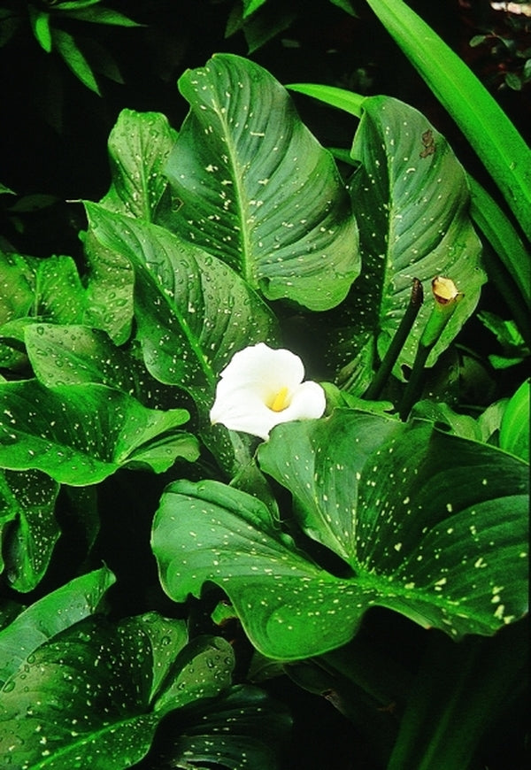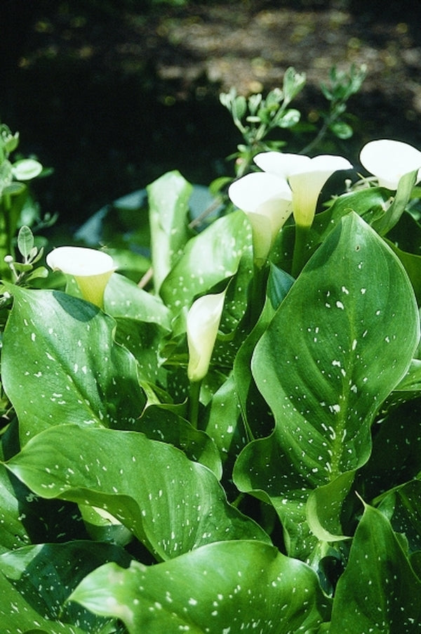 We selected this extremely vigorous and stunning new calla from a batch of South African seedlings. Instead of having green foliage as is typical in Zantedeschia aethiopica, Zantedeschia 'Whipped Cream' has large green leaves that are heavily spotted with large white dots... like blue jeans after a bad day of painting. For us, it tries to grow all winter, but is finally cut down by temperatures below 12 degrees F. In spring, the leaves burst forth again, topped in late spring with stunningly beautiful, pure white, funnel-like flowers. For us, the flowering ceases in midsummer, but resumes again in September and continues until frost. While Zantedeschia 'Whipped Cream' prefers moist sites, it performs quite well in all but the driest of garden spots.