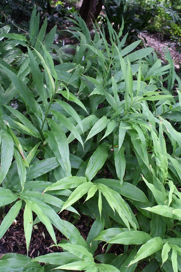From the Japanese woodlands comes this hardy edible ginger. The 3' stalks of green leaves make a tropical-looking specimen in the woodland garden. From late summer through fall, the small, light yellow, orchid-like flowers peek out from the base of the plant at ground level. In Japan the new shoots and flowers are eaten as a seasonal dish.
